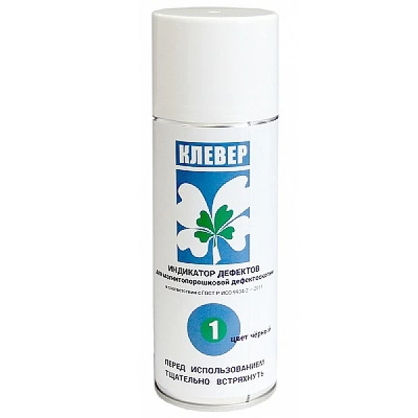 Индикатор дефектов для магнитопорошковой дефектоскопии "КЛЕВЕР-1" - предназначен для обнаружения поверхностных и подповерхностных дефектов в изделиях, деталях и полуфабрикатах из ферромагнитных материалов при проведении неразрушающего контроля методом магнитных частиц по ГОСТ 21105 Способ применения Перед началом каждого использования баллон тщательно встряхнуть в течении нескольких минут. На очищенную и сухую контролируемую поверхность с расстояния 20-25мм нанести жидкую магнитную суспензию до полного и обильного смачивания. Контроль проводится методом приложенного поля или методом остаточной намагниченности.