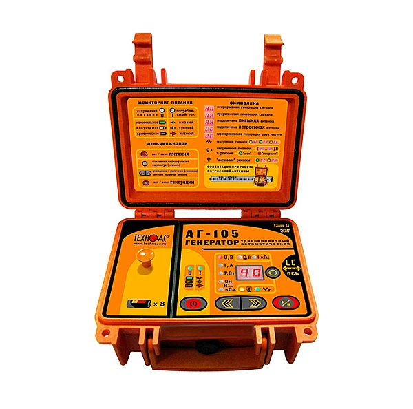 Генератор трассировочный импульсный автоматический АГ-105 предназначен для создания распространяющихся сигналов (колебаний) в трассах скрытых коммуникаций при активном методе трассопоиска. Прибор создает в исследуемой коммуникации переменный синусоидальный ток (постоянно или кратковременными посылками) необходимый для определения ее местоположения.