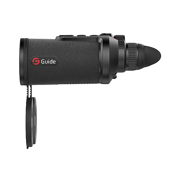 Визуально тепловизионный бинокль TN630 выглядит несколько необычно – внешне он напоминает бинокль, внутри это конструкция с одним объективом и двумя цифровыми экранами для комфортного наблюдения. Изображение с объектива обрабатывается и передаётся на оба экрана, что позволяет комфортно выслеживать цель на охоте, не утомляя глаза. Тепловизионный бинокуляр разработан на базе неохлаждаемого ик-детектора VOx, и полноцветным OLED-дисплеем с высоким разрешением 1024×768 пикселей. Плотность пикселей у TN630 составляет 12μm, инженеры Guide позаботились об идеальном качестве изображения. Частота обновления изображения составляет 50 Герц. Быстрая и точная обработка кадров - чёткая картинка без задержек и шлейфов, не дёргается как у тепловизоров с 9Гц. Кнопки управления расположены сверху и немного выступают над корпусом для облегчения доступа в темноте.