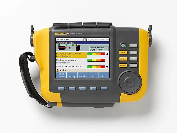 На цветном 5,7-дюймовом VGA-дисплее, которым оснащён виброметр Fluke 810, отображаются результаты вибрационного воздействия (спектры, пиковые значения, степень критичности неполадки), а также информация по ремонту. Функция самопроверки способствует оптимальной производительности аппарата и увеличивает период его полезной работы.